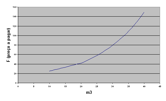 Nas primeiras investigações que fizemos pudemos verificar que o cálculo da tarifa do consumo de água é calculado através de uma função exponencial na qual o expoente varia conforme o consumo de água em m3. E, também que o valor do preço básico e do serviço base variam conforme a categoria da residência, comércio ou indústria.