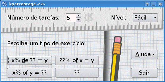 boas-vindas. Aqui você poderá selecionar outro tipo de tarefa ou sair do KPercentage.